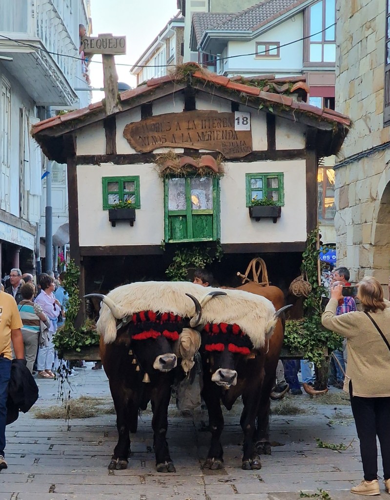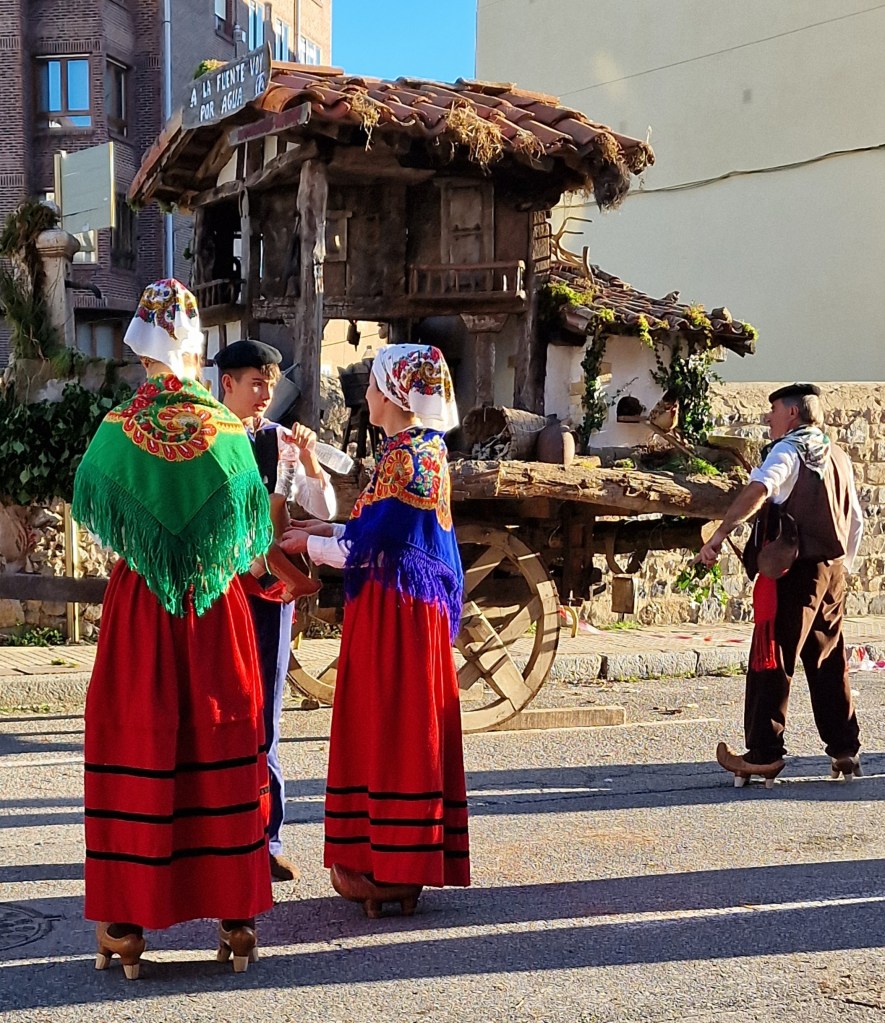 The main event of the day, however, is the parade of the “carretas”, pulled by traditional oxen and Tudanca cows (a native Campurrian breed). The carts each come from villages in the Campoo area and display historical traditions, even going as far as to have replicas of rural houses from times past. Many people wore traditional costumes including clogs. My understanding is that these clogs were to keep clothing and feet out of the muddy streets.