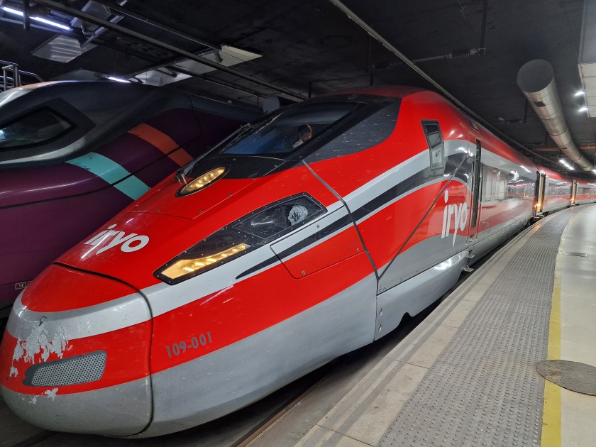 Whilst in Grenoble I had a call from James who said he was going to be in Madrid for a conference in early July. I was invited to join him. So I took the opportunity to go by train, – a wonderful journey. From Grenoble I took the local train to Lyon and then got the TGV all the way to Barcelona. Changing trains I boarded another high-speed train – the Frecciarossa (Italian) train operated by the Spanish railway company Iryo. It took all day but I didn’t care because I had a wonderful journey. I think the top speed was about 300 km/hr. The distance covered was over 1,200 km.
