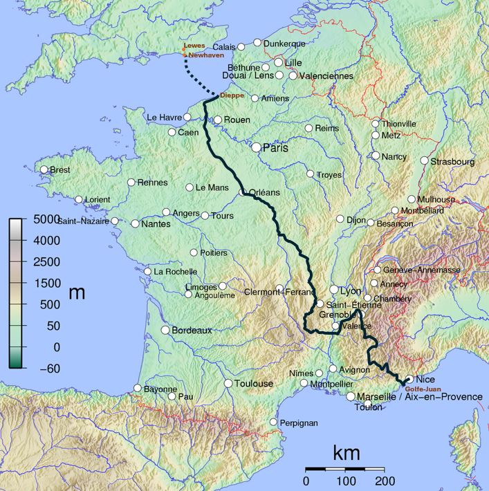 I have completed the 1000 mile cycle ride from the South of France to Dieppe then returning to England via the ferry to Newhaven. My aim was to complete the journey in about a month. It took me 22 days! I followed the Route Napoléon from Golfe-Juan, near Cannes on the south coast of France to Grenoble at the foot of the French Alps. From there I travelled to the source of the River Loire in the Massif Central and then follow the course of the Loire to Orléans. Then turning north across to the cathedral city of Chartres and to the River Seine, crossing west of Rouen and finally to the Normandy coast and Dieppe