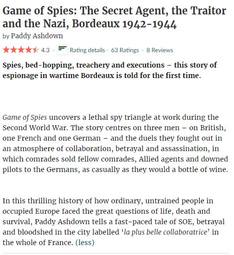 This is a fascinating story by Lord Ashdown (Paddy Ashdown). Whilst the story recounts the heroic actions of many SOE and French resistance agents, it focuses primarily on three people – a British secret agent Roger Landes; the Gestapo counter-espionage officer Frederick Dohse; and a French resistance leader André Grandclément who was responsible for most of the controversial betrayal that took place in France from 1942 to 1944. At first, I thought this was going to be documentary recounting the many conflicts between the Gestapo and the resistance and SOE in France. But it’s more than that, – it’s a gripping story that unfolds during World War II from the time the SOE agents are trained in England to the final days of the liberation of the Bordeaux area and the snub given to British agents by General de Gaulle. The book was clearly painstakingly researched – there are literally hundreds of references. Highly recommended!
